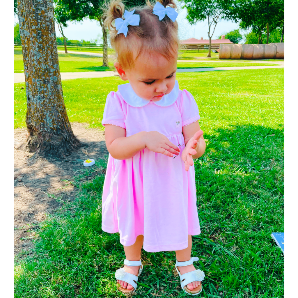 Dress your little one in the softest, most durable Pima cotton with this pink dress by Baby Owl Kids. This hypoallergenic dress is perfect for any occasion and features a white collar with pink picot trim and looped lace trim on the sleeves. Made in Peru, the best quality for your baby's delicate skin. Care is easy - washer and dryer safe!